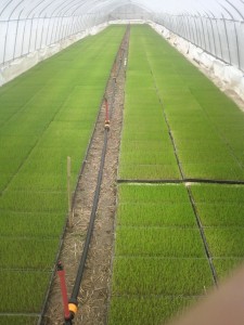 ハウスの中は暑いし、テッパで運ぶのは難儀ですが、整然と並べられた苗箱は快感です。