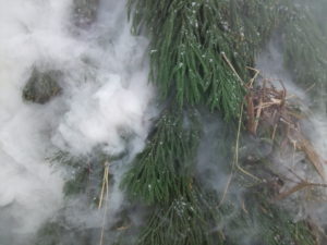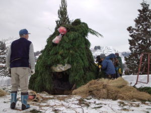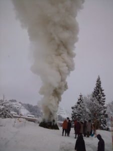 駅長のひとらしゃべり 投稿日時: 2018年1月14日 投稿者: いりひろせ 1月14日(日)号 いよいよ賽の神点火8:00。 杉っ葉の衣をまとってドッシリと落ち着いた「堂」が何とも頼もしい。 杉っ葉の隙間から、煙が静かにそろそろと噴き出る様は、神秘的な生命を感じる。 空は青く無風。 綿雪が優しく舞い降りる中、猛烈なパワーで真っ直ぐに昇る。 「ほっけにいい賽の神はめったにねえねや・・・。」 今年はきっと豊作に・・・。 皆衆がいい年になります様に・・・。 子供は貞太郎1人っきり。 昔の半分もいねえのし。 そいじゃ又のんし。 駅長 貞一