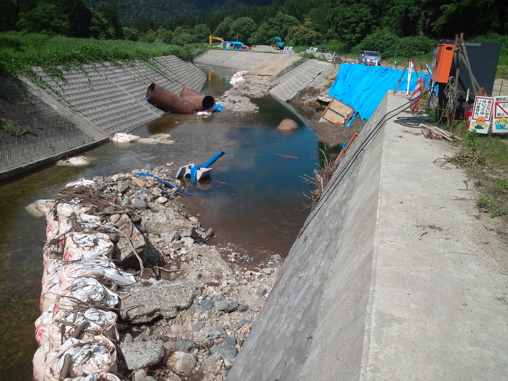 駅長のひとらしゃべり 投稿日時: 2018年7月1日 投稿者: いりひろせ 7月1日(日)号 想定内 調子良く焼きまくってるところへTEL有り。 「・・・締め切りがやられた・・・鉄管もかなり・・・」 ヨッペナ、雨は大した事なかったが・・・と思いながら、現場へ直行。 「ありゃりゃー❢」とは思ったが・・・。 「ならばどうする?」 幸いな事に、ブロックの基礎は完了❢ 「手戻りは最小限」と気を取り直して、大雨のタイミングとしてはラッキー☆ これみんな想定内‼ そいじゃ又のんし。 駅長 貞一