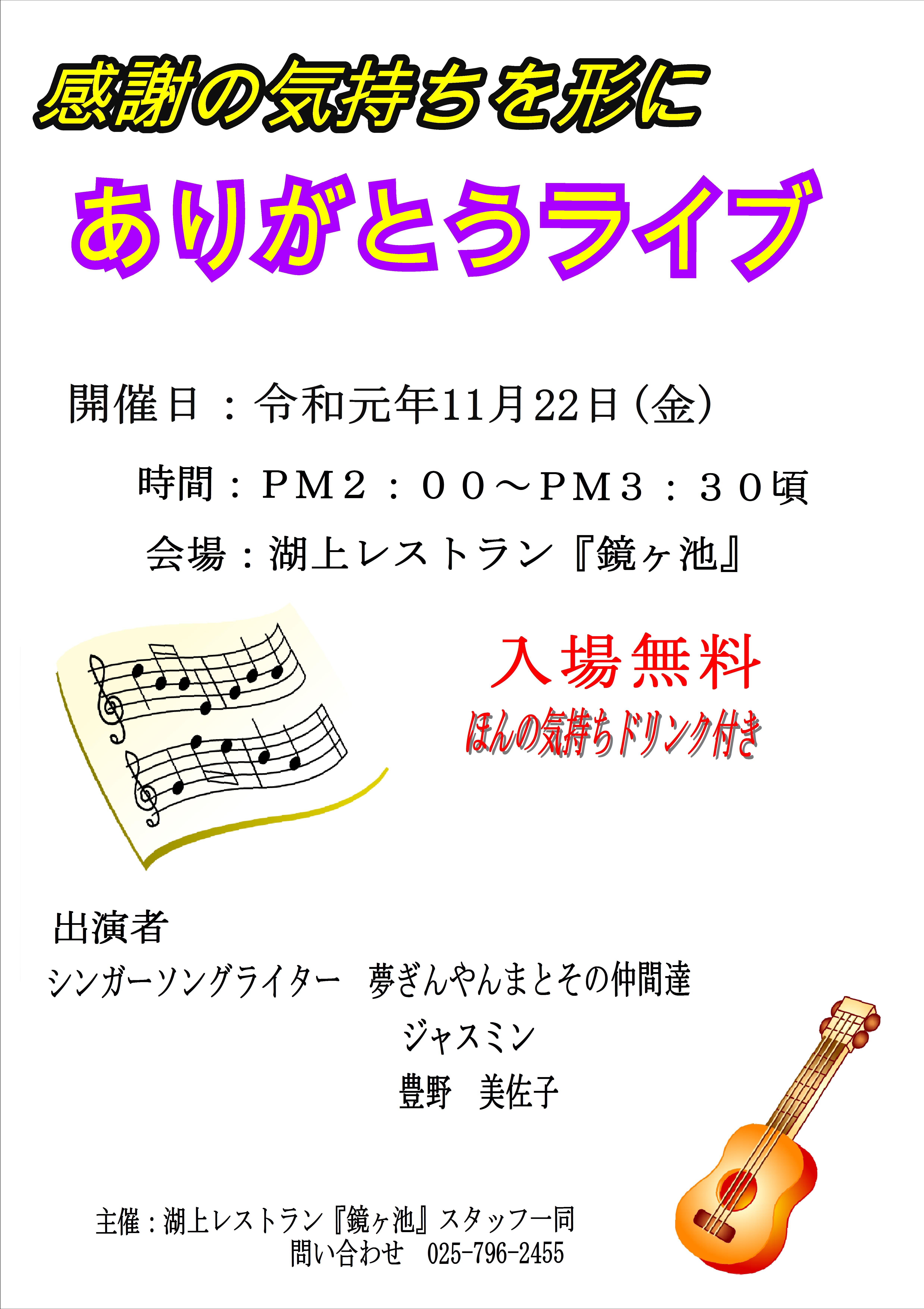 お知らせ 投稿日時: 2019年11月11日 投稿者: いりひろせ 11月22日(金)14:00より、湖上レストラン「鏡ヶ池」を会場に 「ありがとうライブ」を開催します。 それに伴いまして、レストランの営業を13:00で終了致します。 ご理解のほどよろしくお願い致します。 ライブは入場無料ですので、気軽に遊びに来て下さいね☆