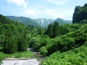 大雲沢に雪を残す守門岳と雪融け水の守門川。