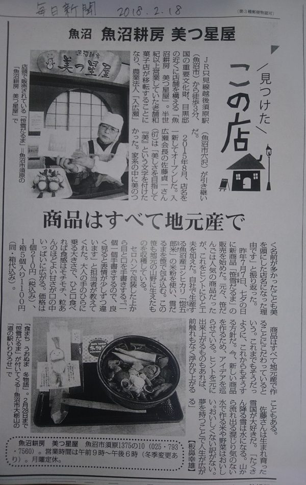 駅長のひとらしゃべり 投稿日時: 2018年2月21日 投稿者: いりひろせ 返信 2月21日(火)号 気になってしょうがない・・・ 毎日新聞の記事です。 なんせ、国道を走る度に『笹雪だるま』のノボリが気になってしょうがなかったという記者の言葉が嬉しいのんし。 オラもそういう言葉をかける人にならんばんと思ったんし。 そいじゃ又の~。 駅長 貞一