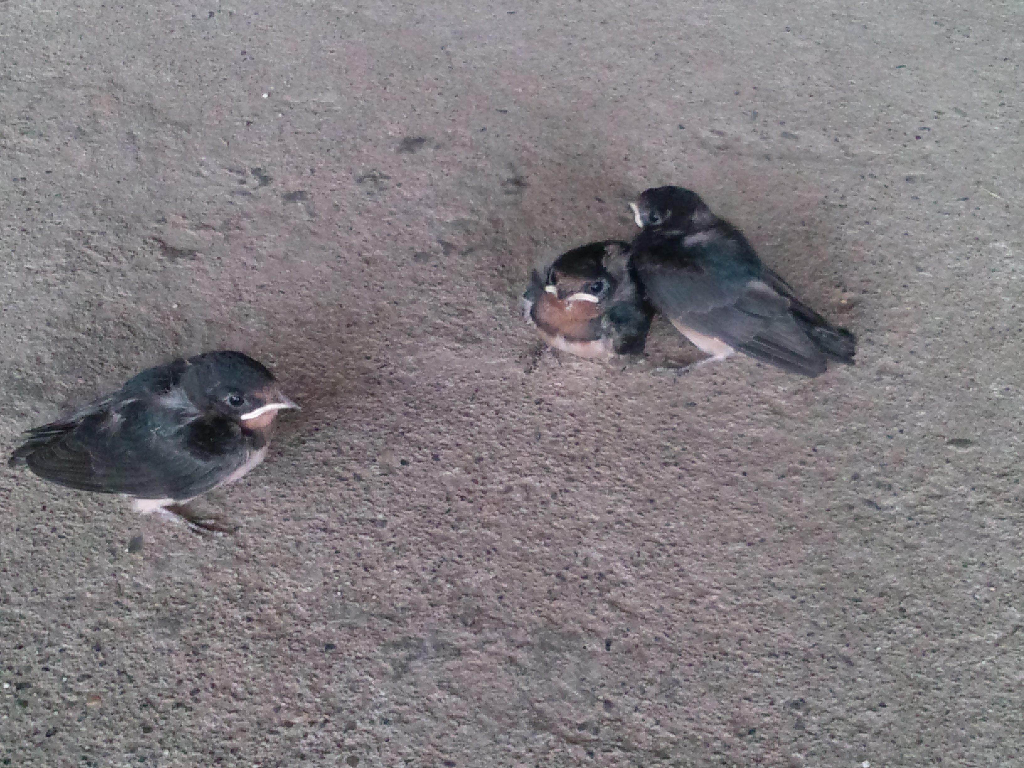 つばめのヒナが3羽、土間コンの上でうずくまったりヨチヨチ歩いたり・・・。